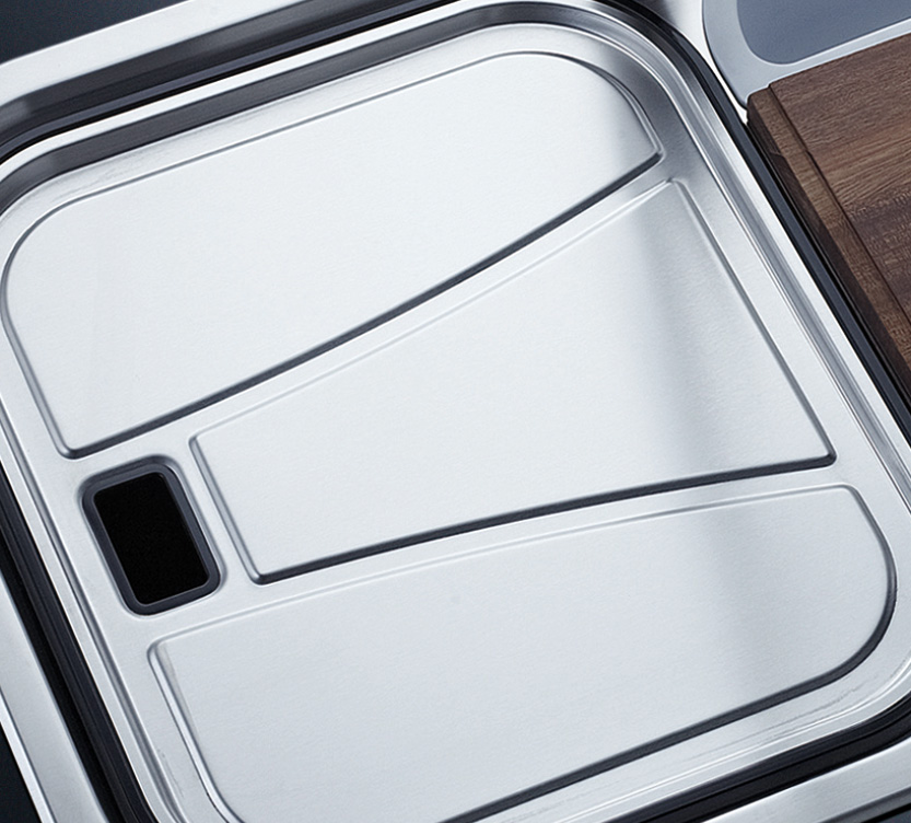 槽底采用斜面壓痕,四輻導流槽設計,與平面壓痕和無痕水槽相比,導水更為流暢,下水更迅速,能有效防止積水,消除沉淀物