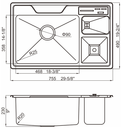 槽底采用斜面壓痕,四輻導流槽設計,與平面壓痕和無痕水槽相比,導水更為流暢,下水更迅速,能有效防止積水,消除沉淀物